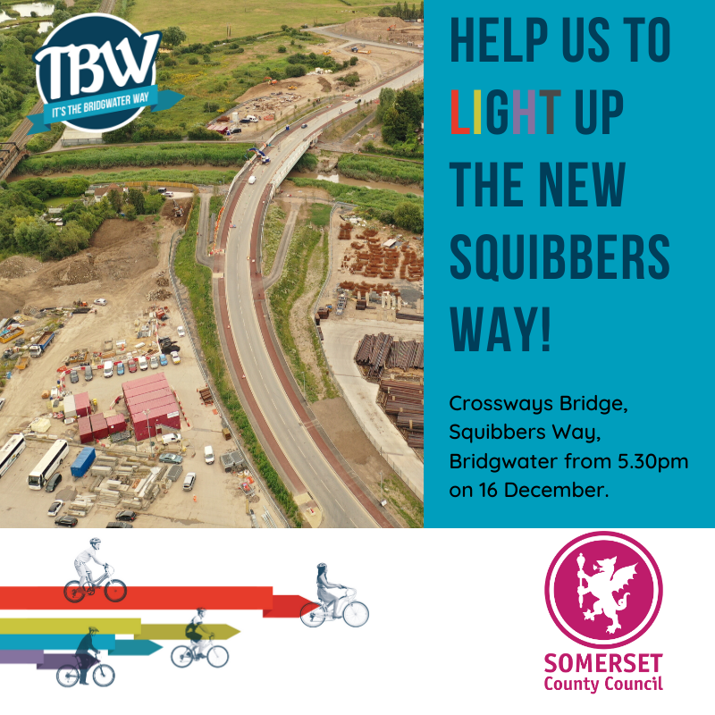 The short opening ceremony will start at 6pm on Monday 16 December on the new Crossways Bridge (the second of the bridges on Squibbers Way). Join us there from 5.30pm to decorate yourself and your bicycle and be part of the Glow Ride that follows Bridgwater Carnival’s Squibbers – you will be amongst the first to cycle the new road!